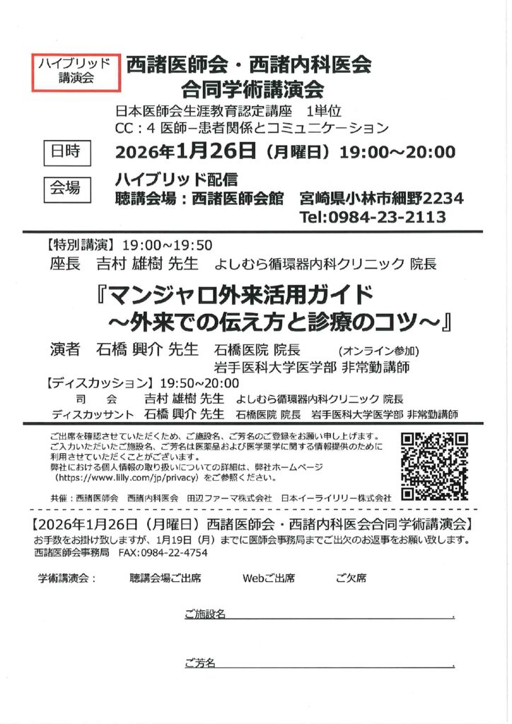 講演会:西諸医師会・西諸内科医会合同学術講演会 2026年01月26日(月)