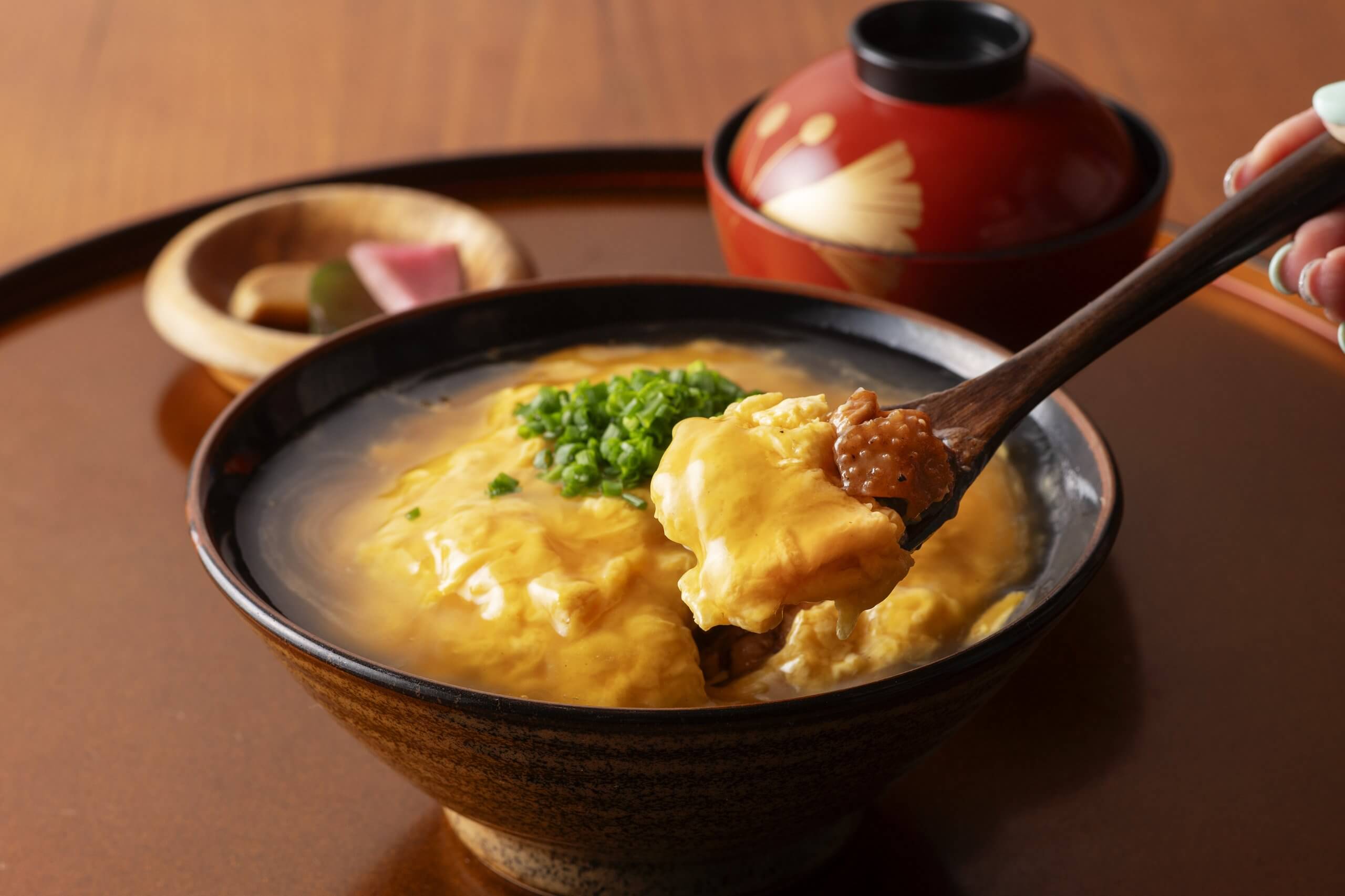 脂の甘みとコクが絶妙ないもこ豚を焼き、にんにくを使った甘辛いソースで絡めた肉の上に、鰹節で取った一番出汁を贅沢に使用しただし巻き卵と明太子をプラス。この3つに野尻産のお米が合わさると、得も言われぬ美味しさに! 地元産にこだわったボリューム満点な丼。
